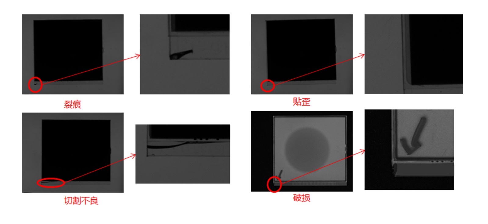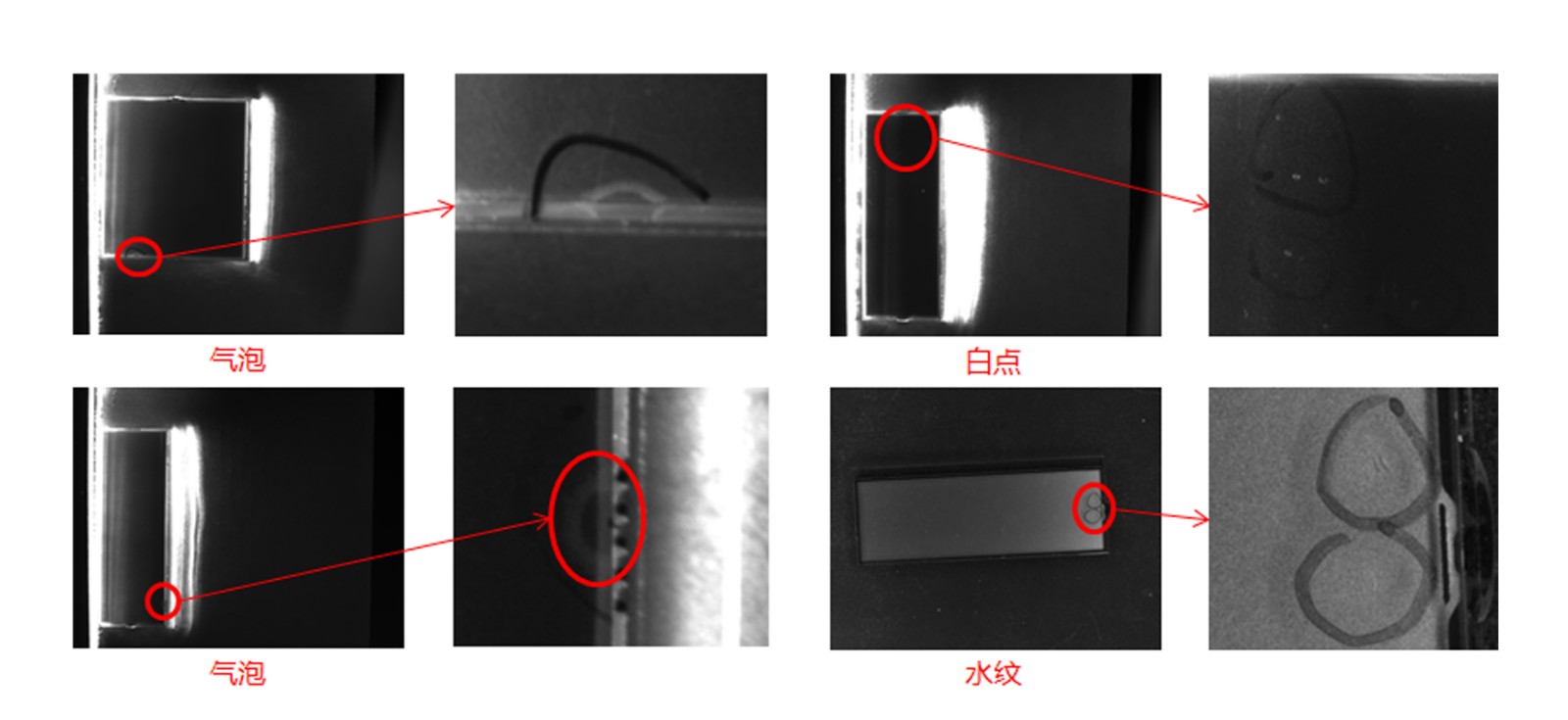刮伤、毛线、内污、气泡、杂质、裂痕、切割不良、贴歪、白点、水纹、破损等缺陷